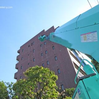 高所作業車を使って高層マンションの換気孔改修工事