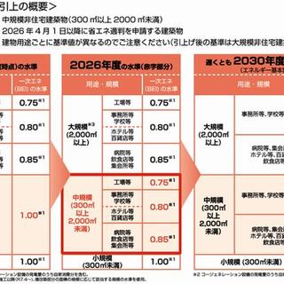 ②300㎡以上2,000㎡未満の非住宅建築物(事務所、店舗など)を、新築・増改築する際、従来の基準(BEI≦1.0)から、さらに高い省エネ性能(BEI≦0.75〜0.85程度)への適合が求められます。
